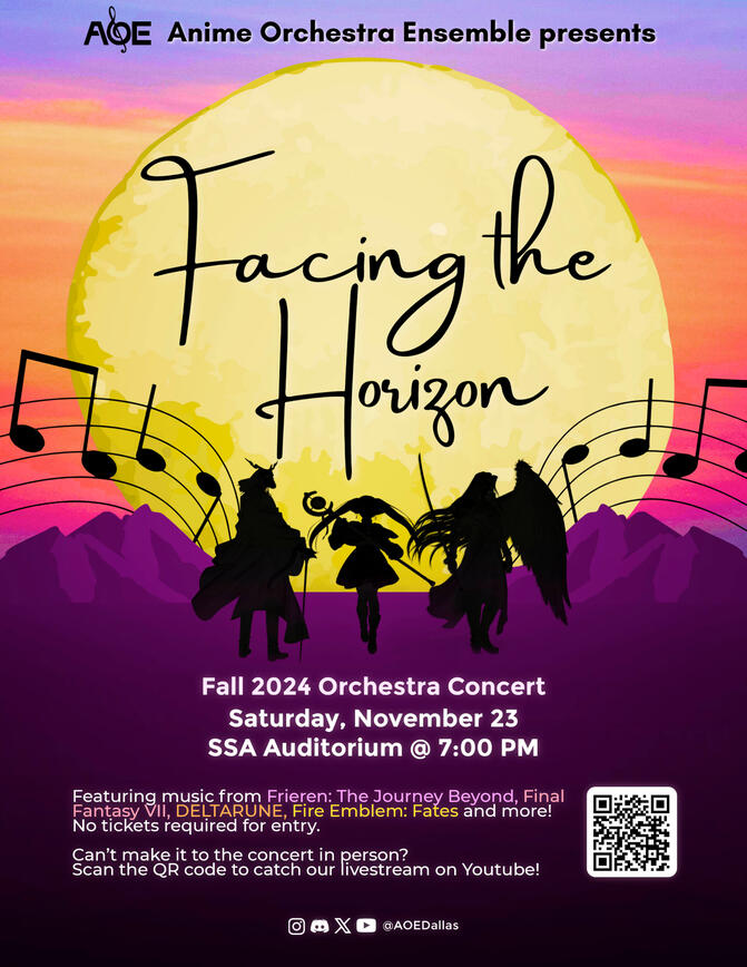 Anime Orchestra Ensemble is a student-run organization that unites UT Dallas students to perform anime and video game music at live events.We provide a vibrant community where fans of various series can meet, connect, and explore their favorite genres.